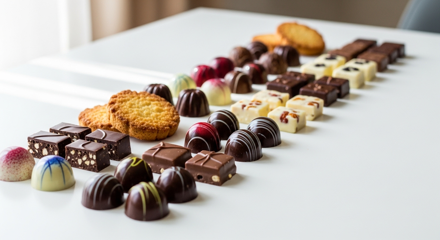 ガナッシュ、プラリネ、キャラメルなど、多彩な味わいが詰まっています。