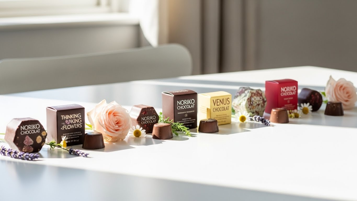 ノリコショコラは、見た目の美しさ、素材へのこだわり、そして「五感で味わう」という体験を大切にしたチョコレートです。