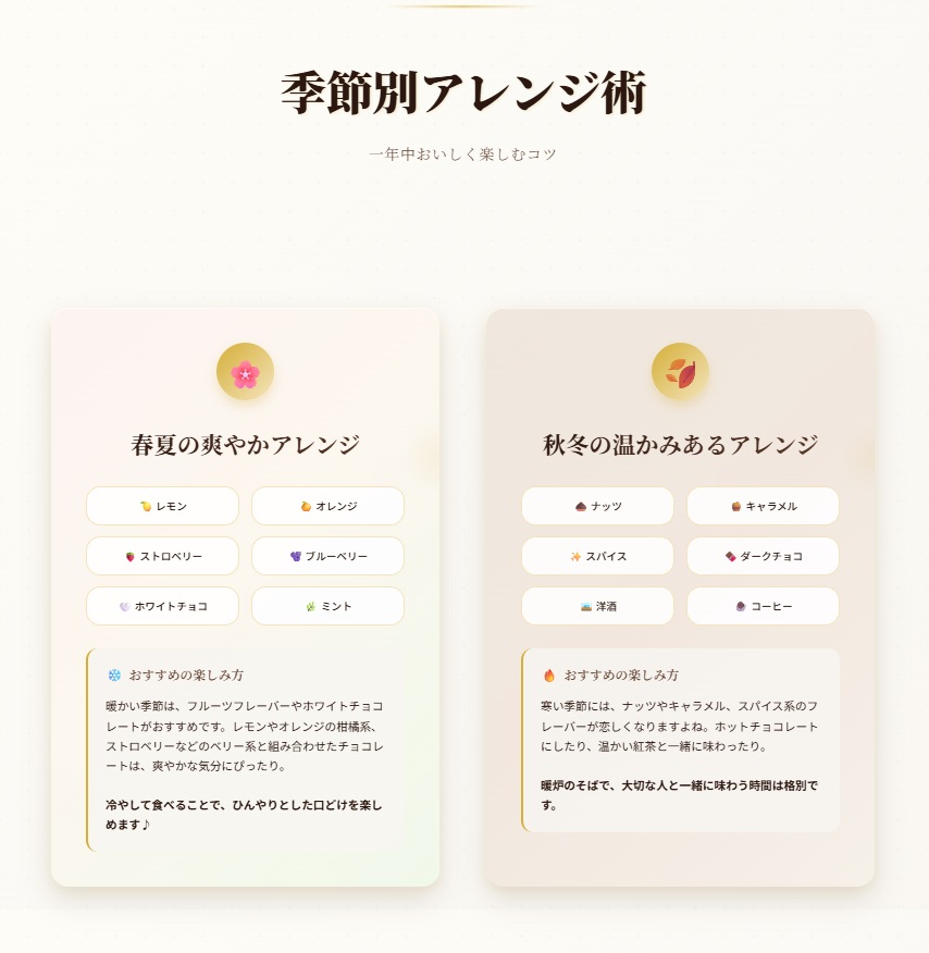 暖かい季節は、フルーツフレーバーやホワイトチョコレートがおすすめです。