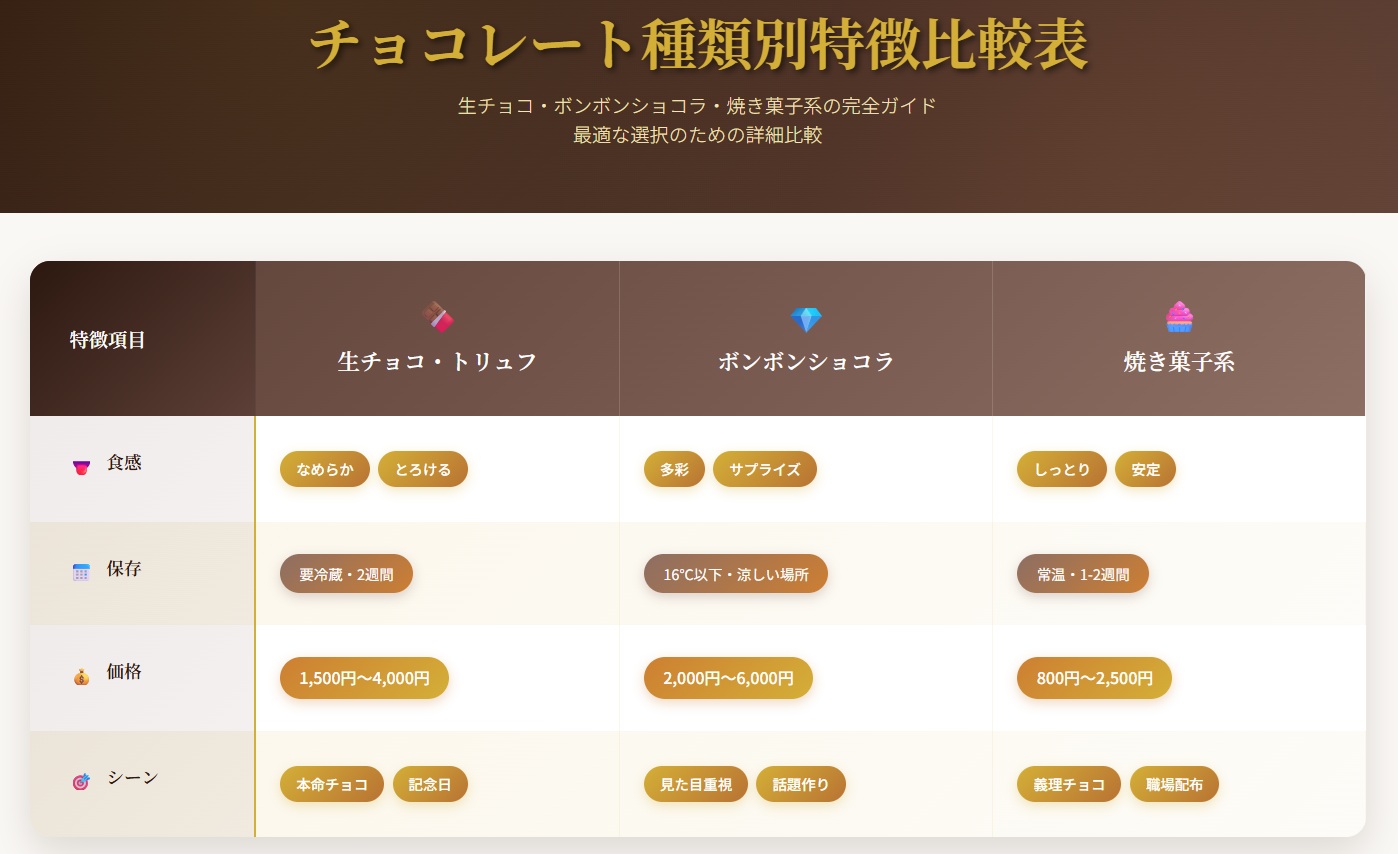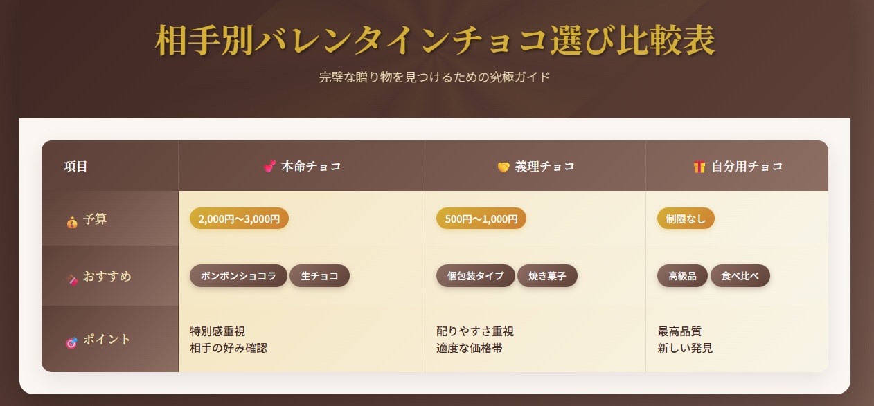 ☑ 相手別の選び方:本命は特別感重視、義理は適度な価格帯、自分用は贅沢に