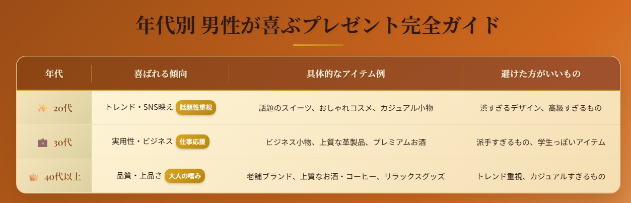 年代によって、喜ばれるギフトの傾向は少し異なります。