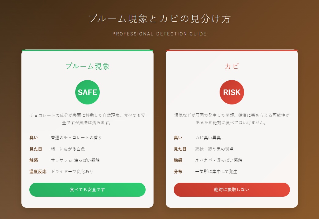 見た目はカビみたいでビックリしちゃいますが、実際はチョコレート自体の成分だから、安心して食べられるんですよ♪