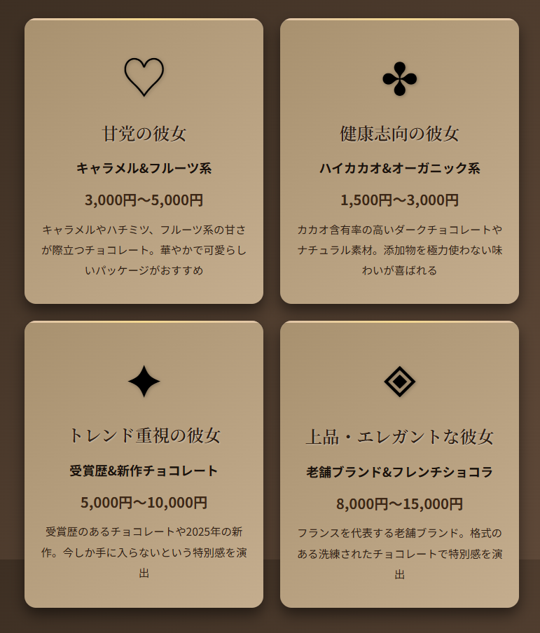 常に最新のトレンドをチェックしている彼女には、受賞歴のあるチョコレートや2025年の新作がおすすめ。