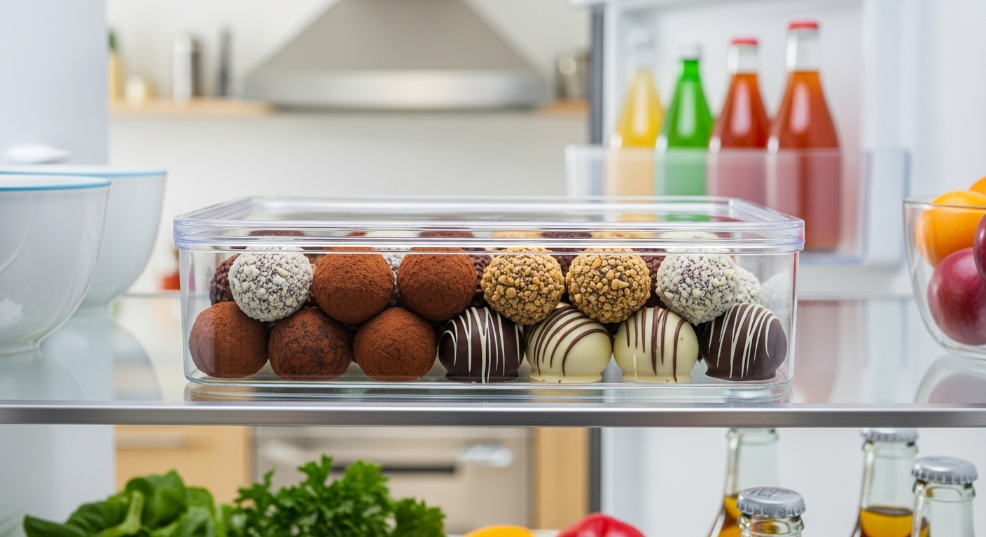 密閉容器にクッキングシートを敷き、トリュフ同士がくっつかないように少し間隔を開けて並べます。