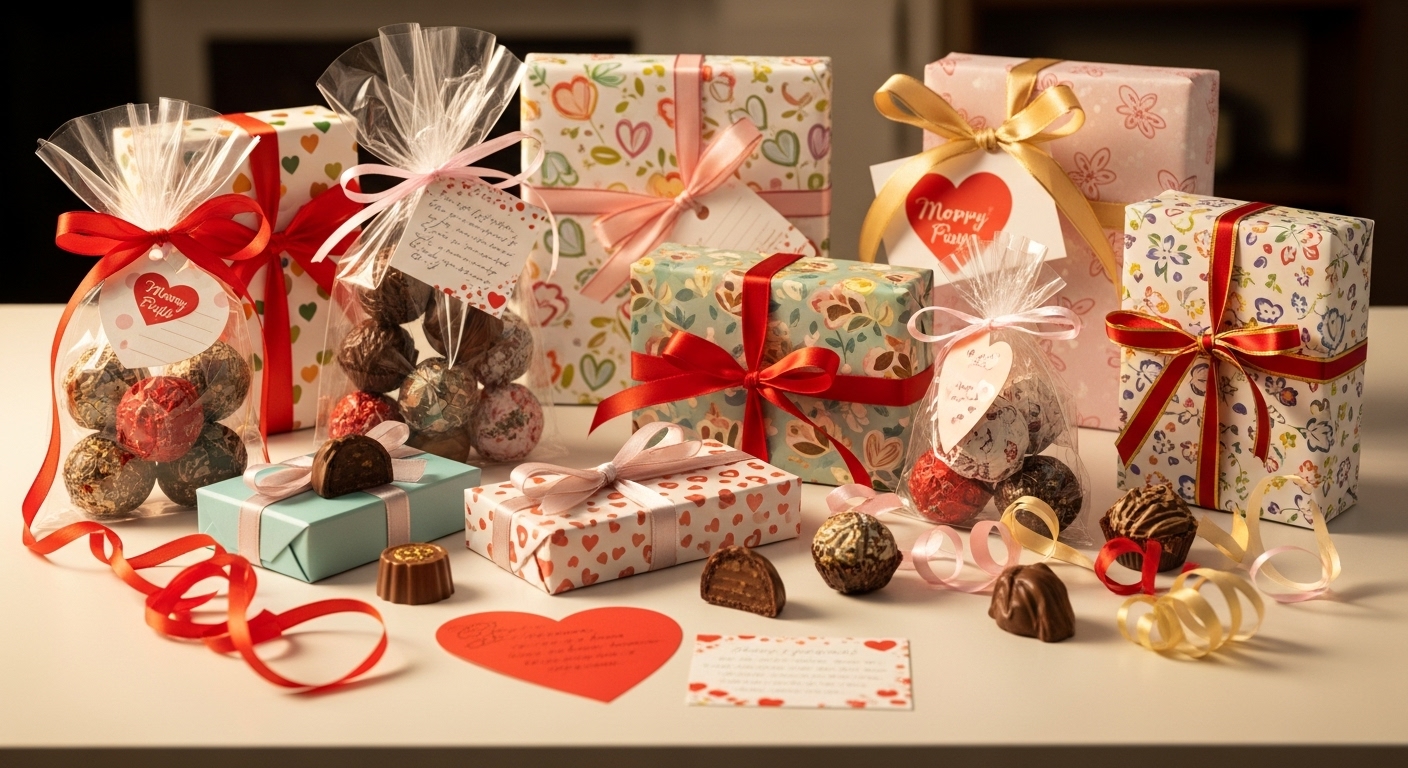 小さな紙コップにトリュフを入れ、透明フィルムで包んでリボンをかける方法も簡単で見栄えが良くなります。