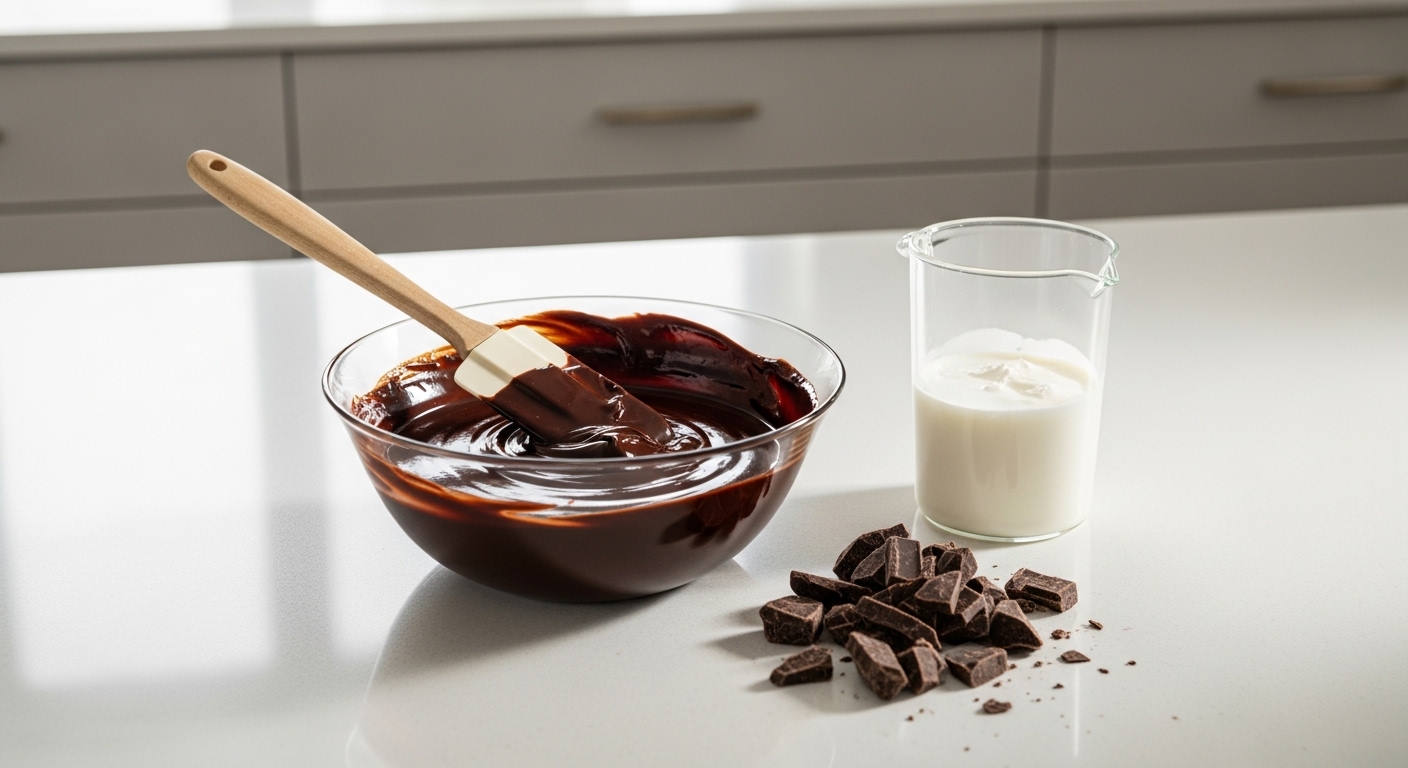 チョコレートを湯煎で溶かし、生クリームを少量加えて滑らかにします。