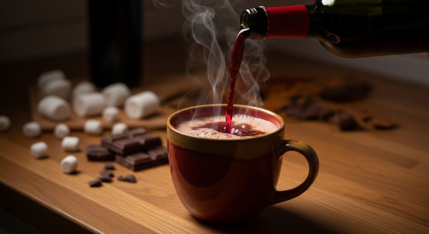ミルクと板チョコレート(ビターまたはミルク)を弱火で温めて溶かし、赤ワインを50〜100ml加えます。