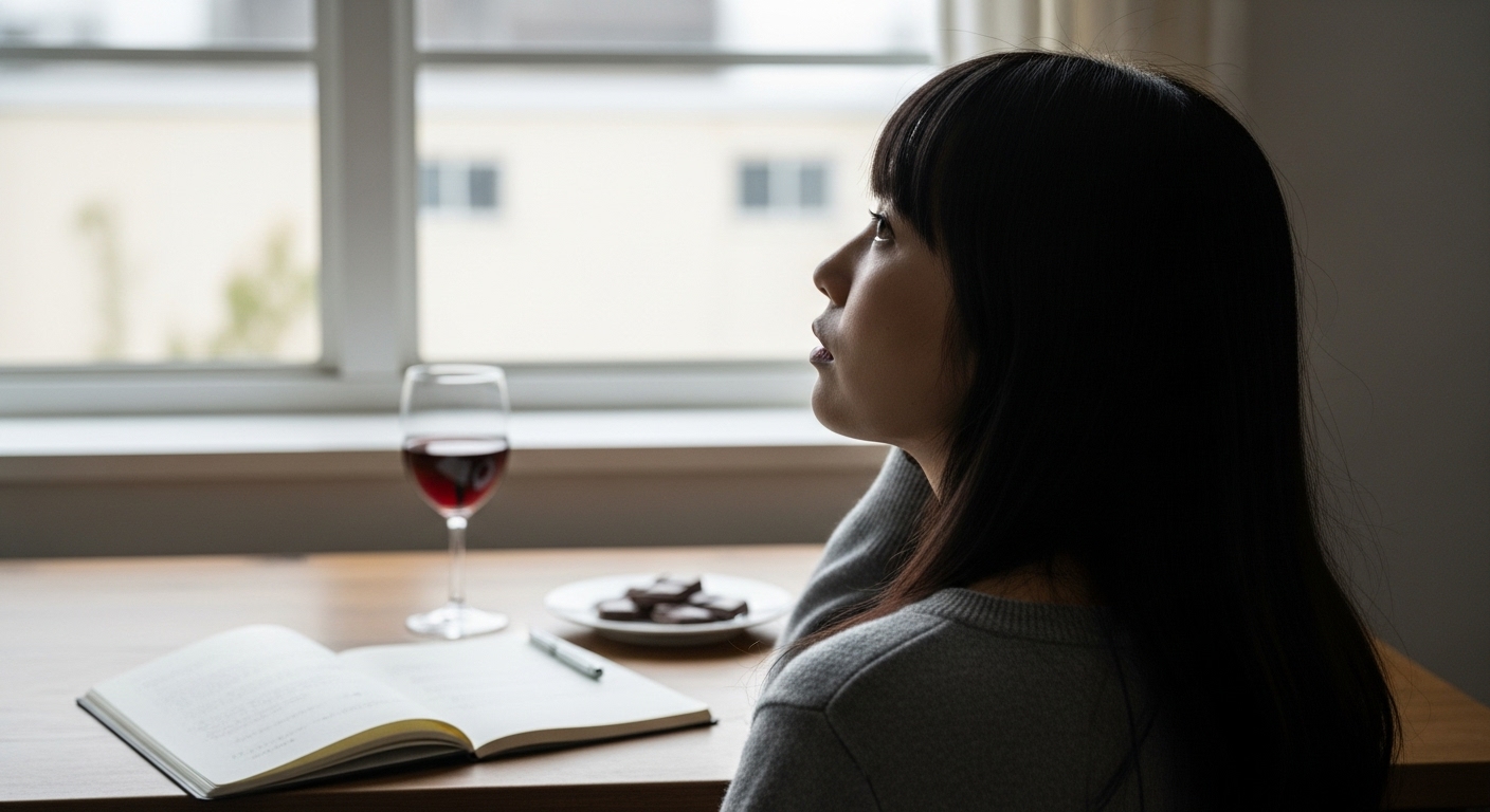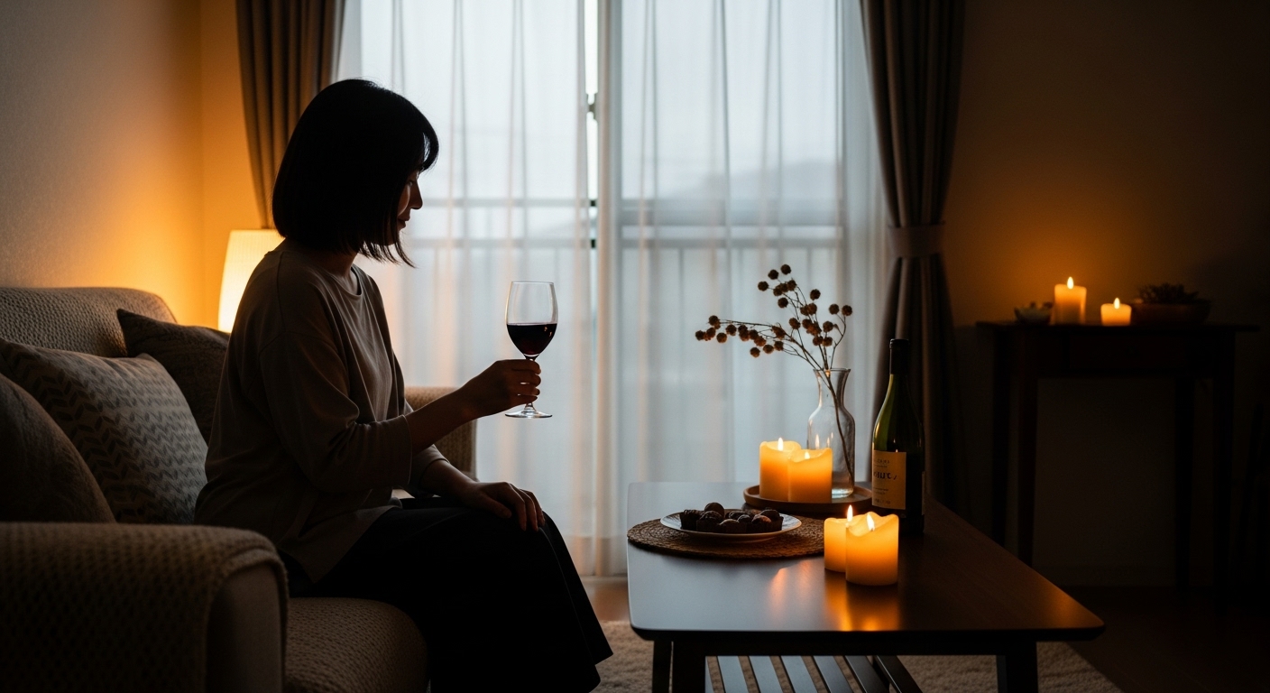 一日の終わりに、自分だけのために用意する赤ワインとチョコレート...このひとときは、日常のストレスから解放される特別な時間です♪お気に入りのグラスに少量のワインを注ぎ、ゆっくりとチョコレートを一口。