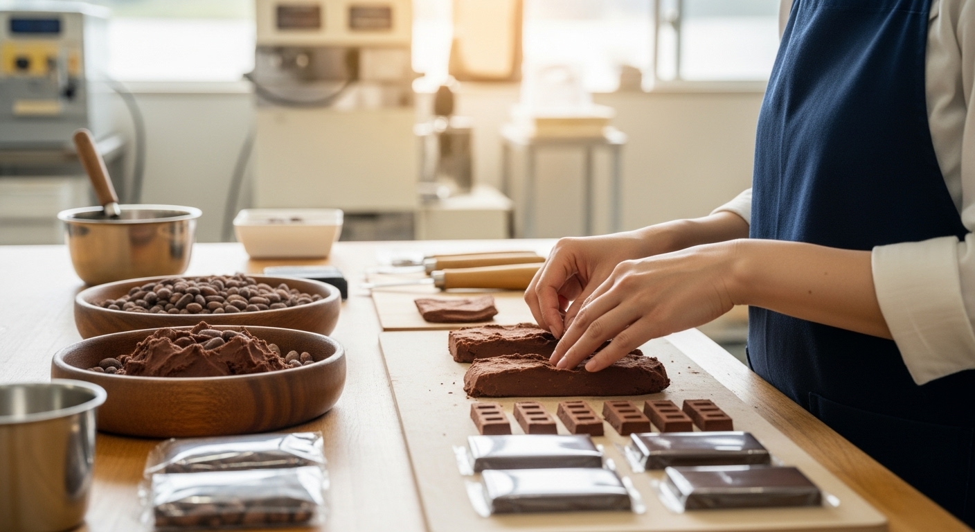 製造工程を知ることで、チョコレートの表面の艶が語る職人の技術が見えてきます。