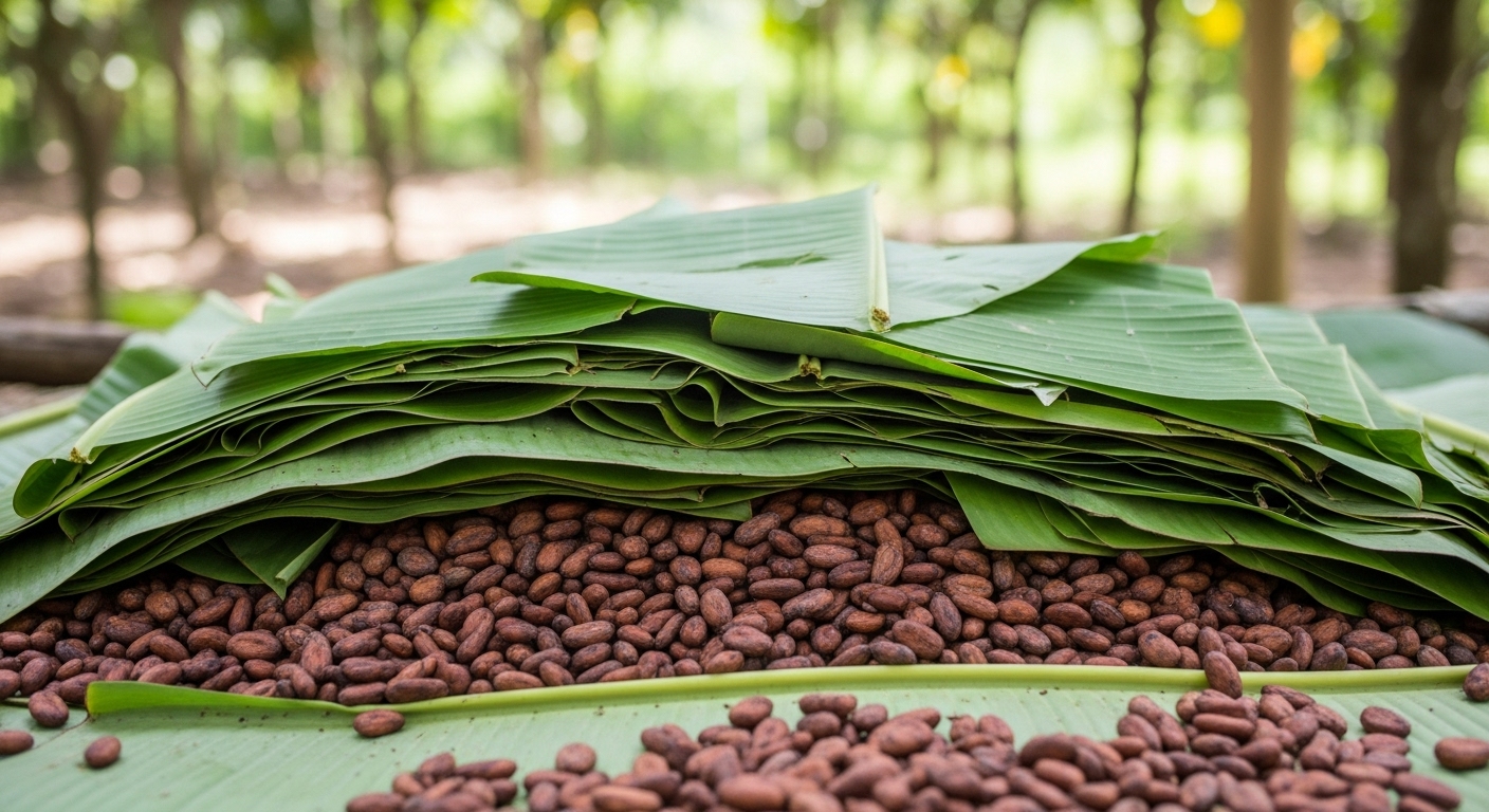 ヒープ法は、カカオ豆を地面に積み上げ、バナナの葉やシートで覆う伝統的な方法です。