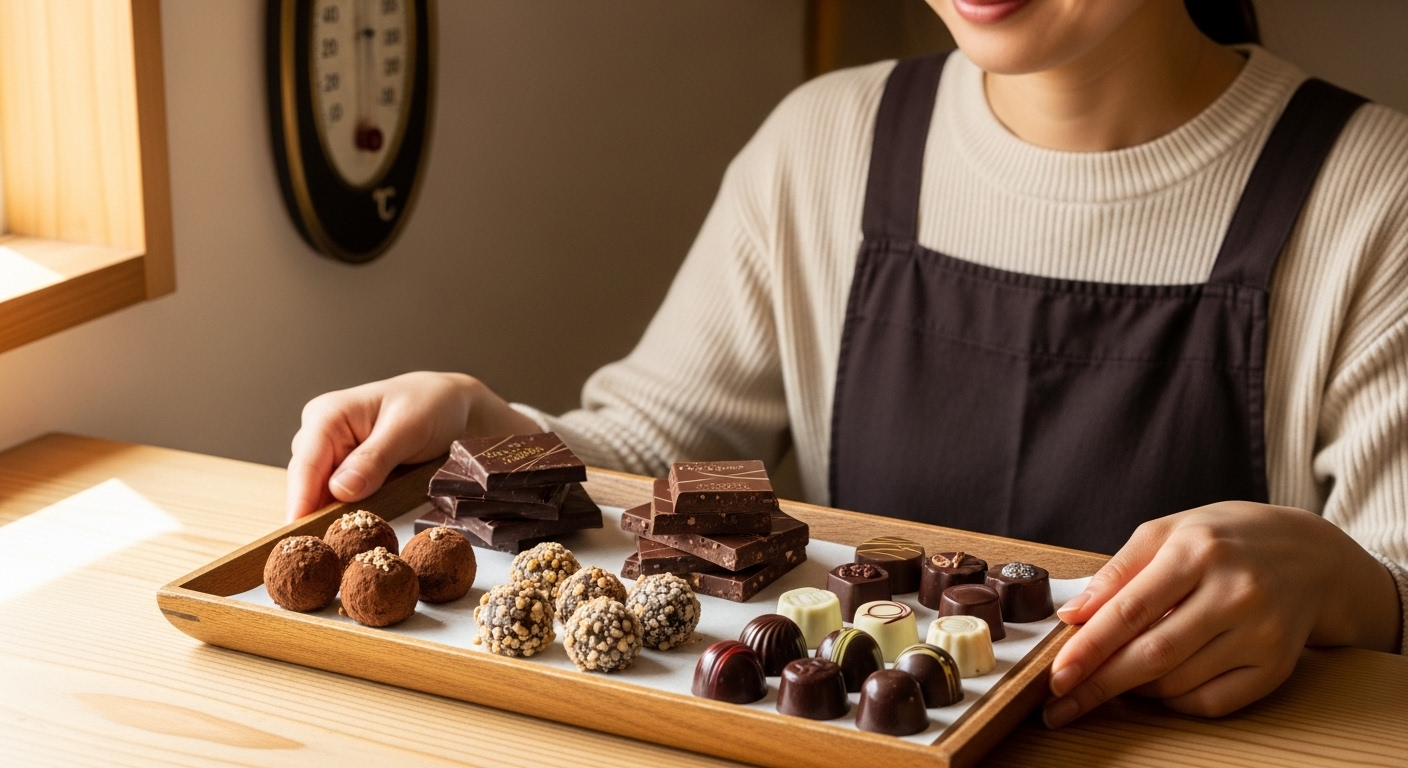 ☑ 種類別のポイント 板チョコは22℃以下で常温可、生チョコは10℃以下で必ず冷蔵、ボンボンショコラは16℃以下が目安