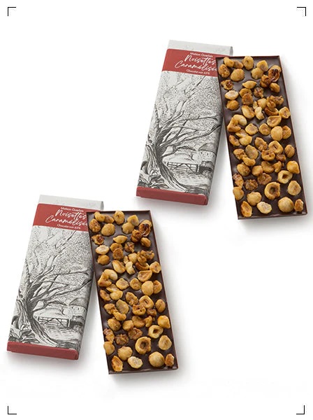 カカオ分41%以上のミルクチョコレートとキャラメリゼしたヘーゼルナッツ。風味豊かなチョコレートとカリカリにキャラメリゼされたヘーゼルナッツチップのコンビネーション。チョコレート好きを虜にする一品。