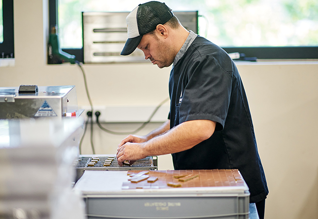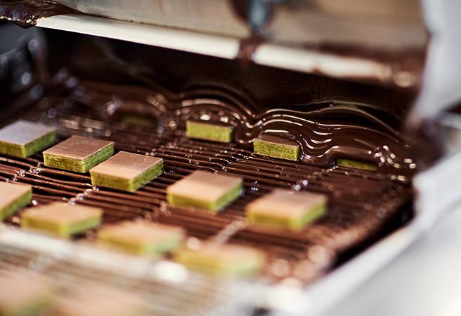 STEP4:チョコレートはテンパリング(温度調整)され、美しい光沢と適切な食感を持つ完成品となります。